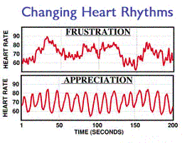 Take a look at the two graphs below and what the emotional states described suggest in terms of feelings of well-being and then notice the difference in Heart Rhythms. This is an accurate representation of one of the screens available in the emWavePro software. Given a choice, which emotional state would you like to be dominant in your body?