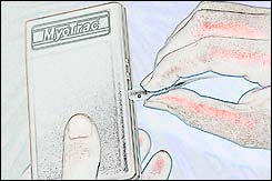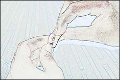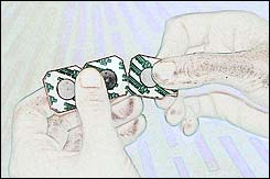 Illustration of removing the protective cover from the adhesive side of a single electrode pad prior to placement. |